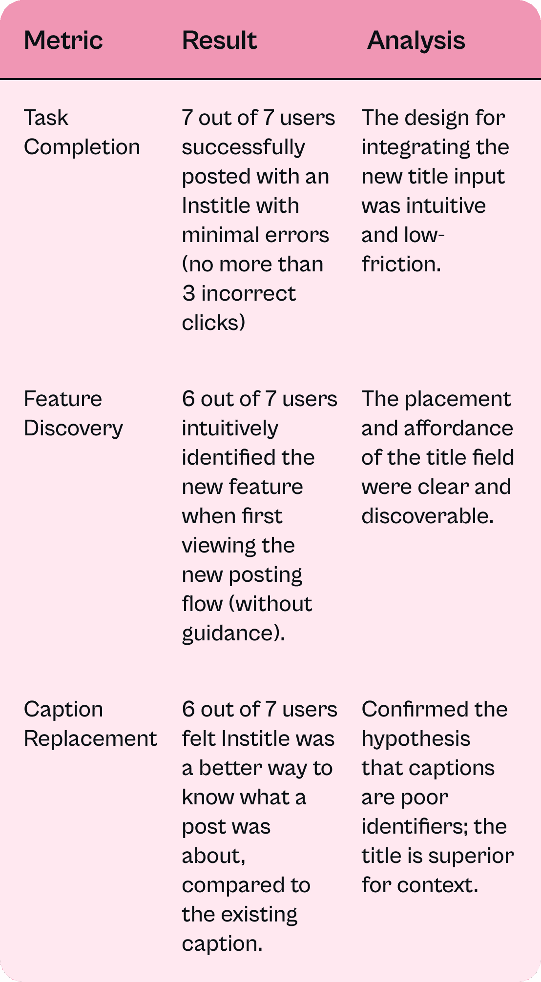 The ultimate success of Institle was measured by its usability and its ability to solve the core problem of content findability. I conducted two rounds of testing (quantitative and qualitative) to validate the designs and ensure a low-friction user experience.